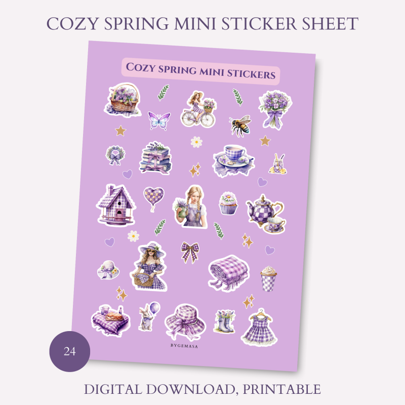 Ontdek onze printable lente collectie met stickers, mini stickers, planner icons, labels en washi tape in zachte paarse tinten.