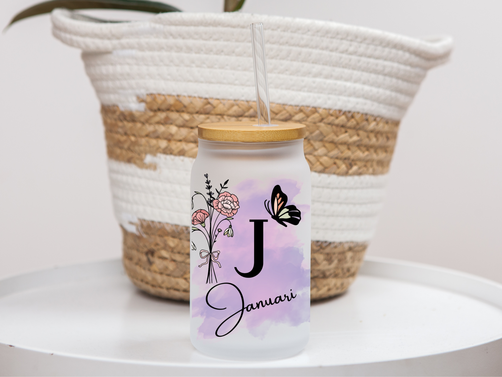 Dit stijlvolle glas is voorzien van een initiaal, naam, geboortebloem en een elegante vlinder , afgewerkt met een subtiele aquarelachtergrond in roze, paars of groen .