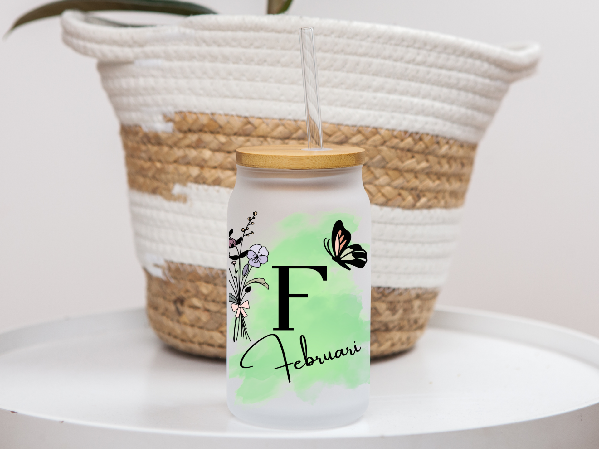 Gepersonaliseerd Glas Februari met Naam, Initiaal en Geboortebloem