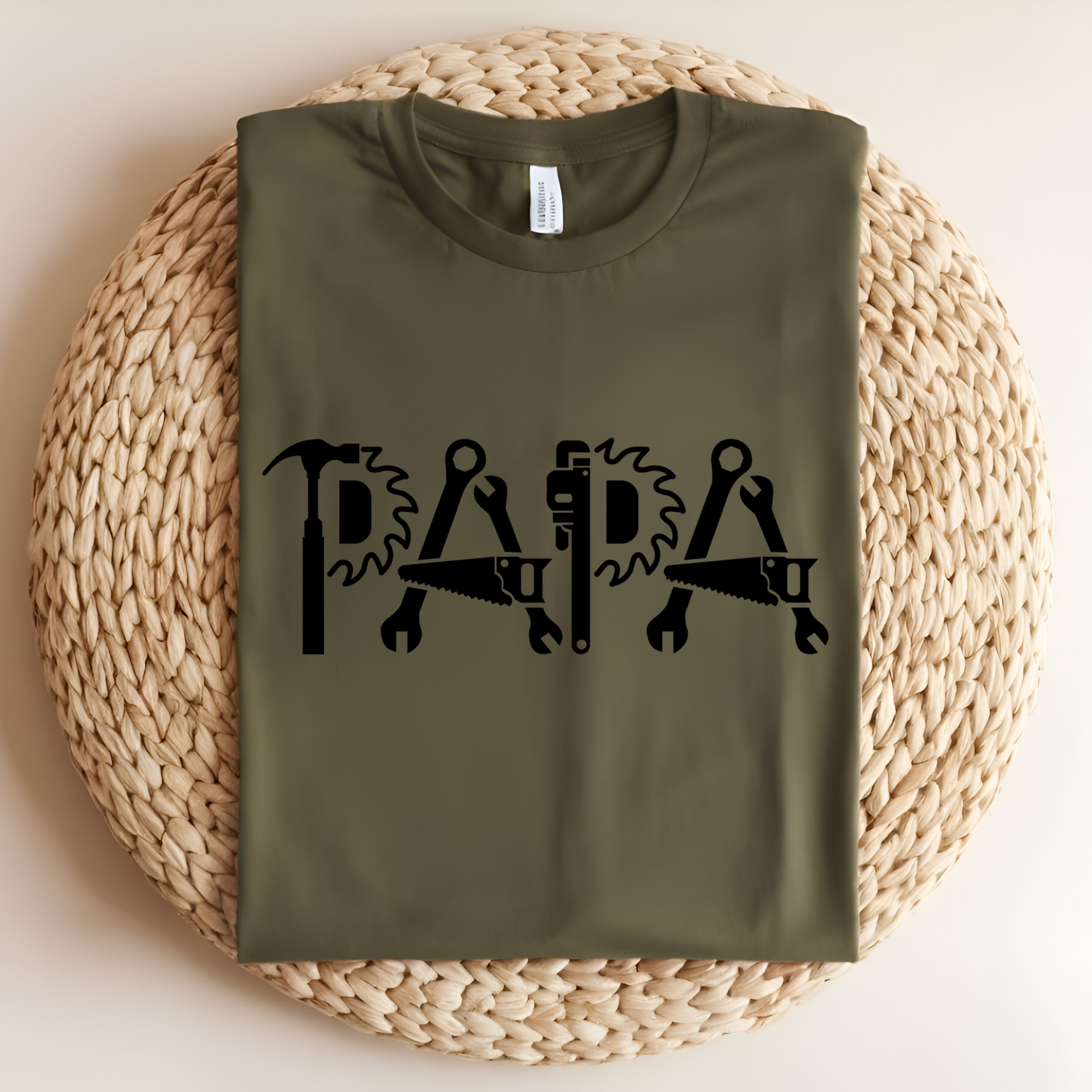 Maak indruk met dit stoere "PAPA" t-shirt, waarvan de letters zijn opgebouwd uit herkenbaar gereedschap zoals hamers, zagen en moersleutels – perfect voor elke handige vader of klusliefhebber.