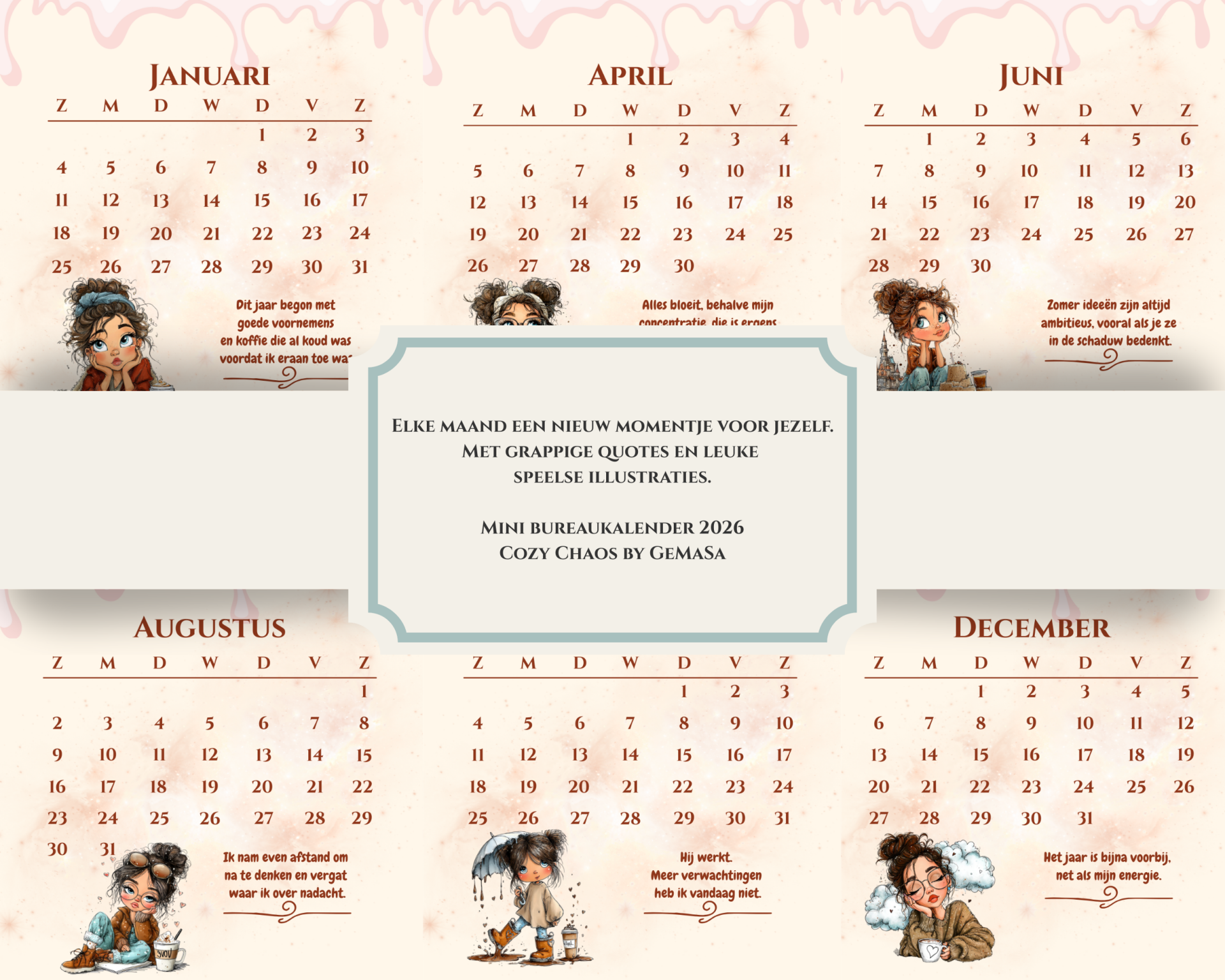De Cozy Chaos mini desk kalender 2026 is er voor iedereen. Of je hem nu op je bureau zet of op een ander mooi plekje in je huis.